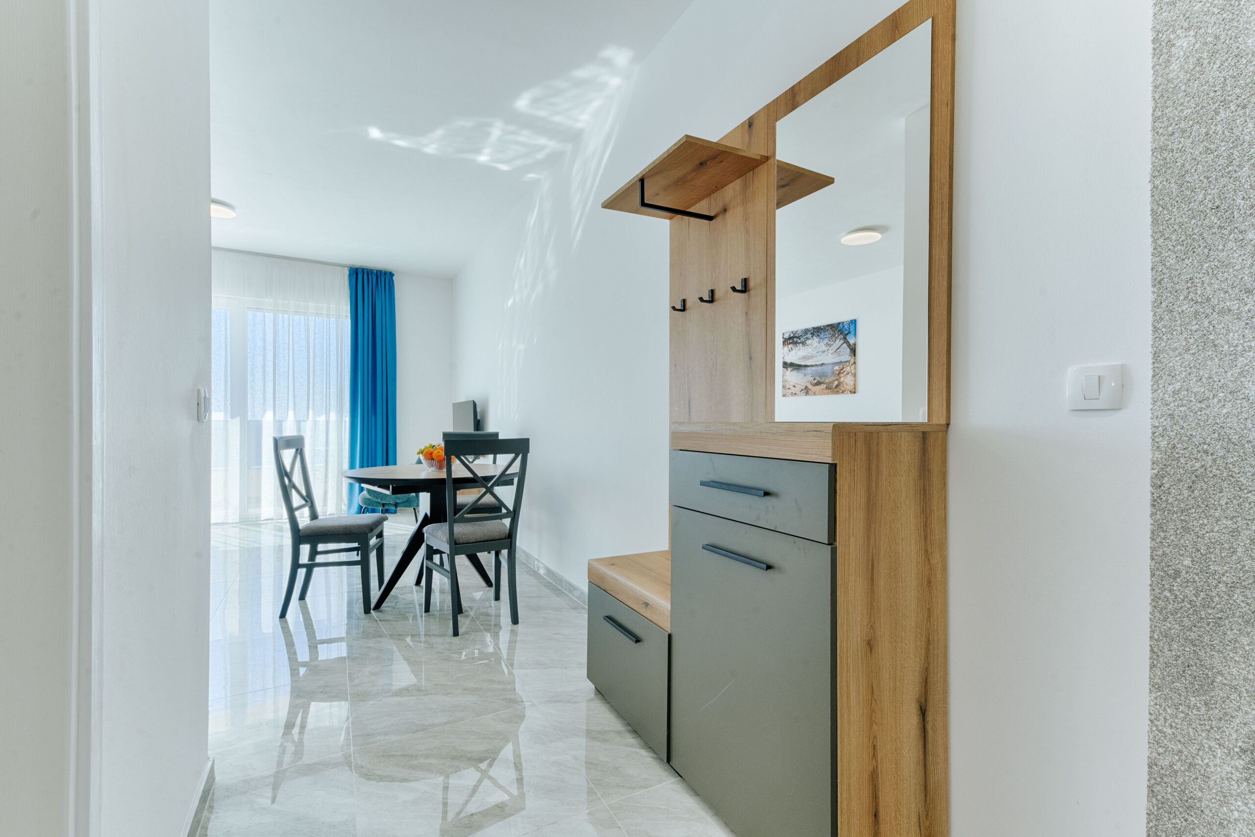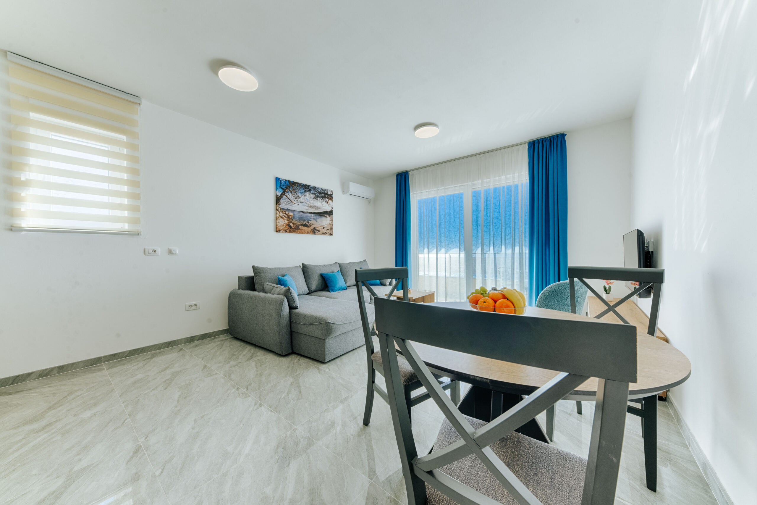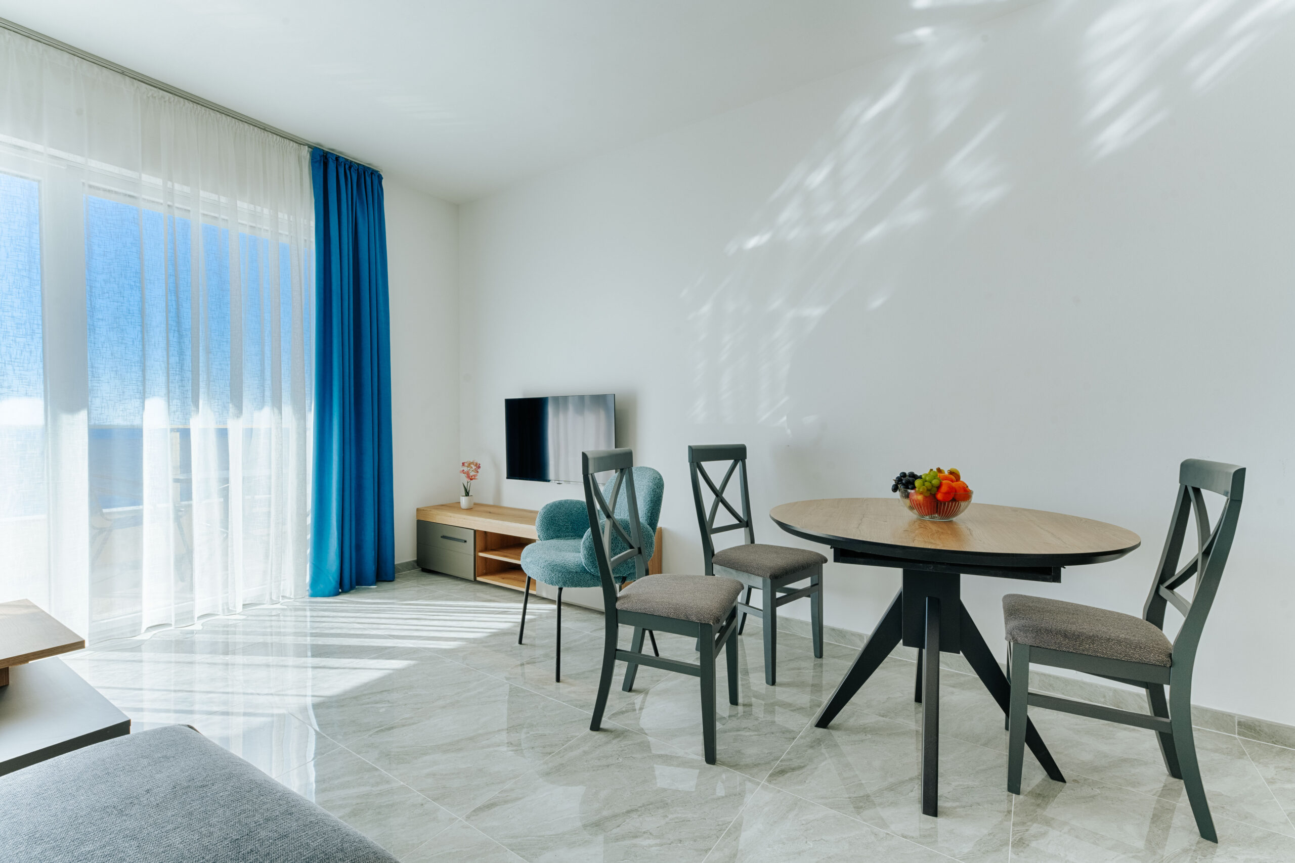 AP14 – Apartament z jedną sypialnią i salonem – max 5 osób zlokalizowany na piętrze trzecim. Apartament posiada balkon z meblami i widokiem na morze.