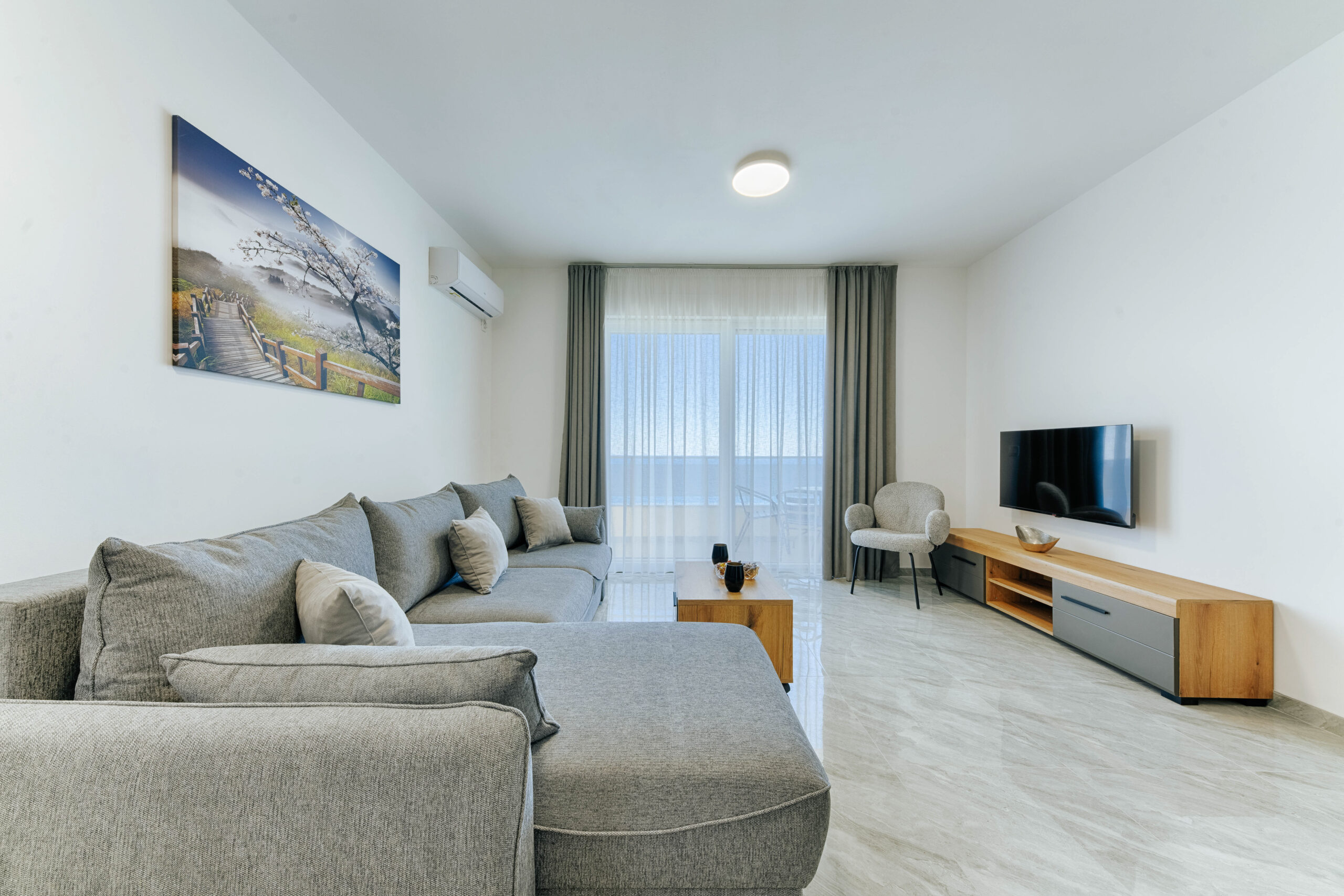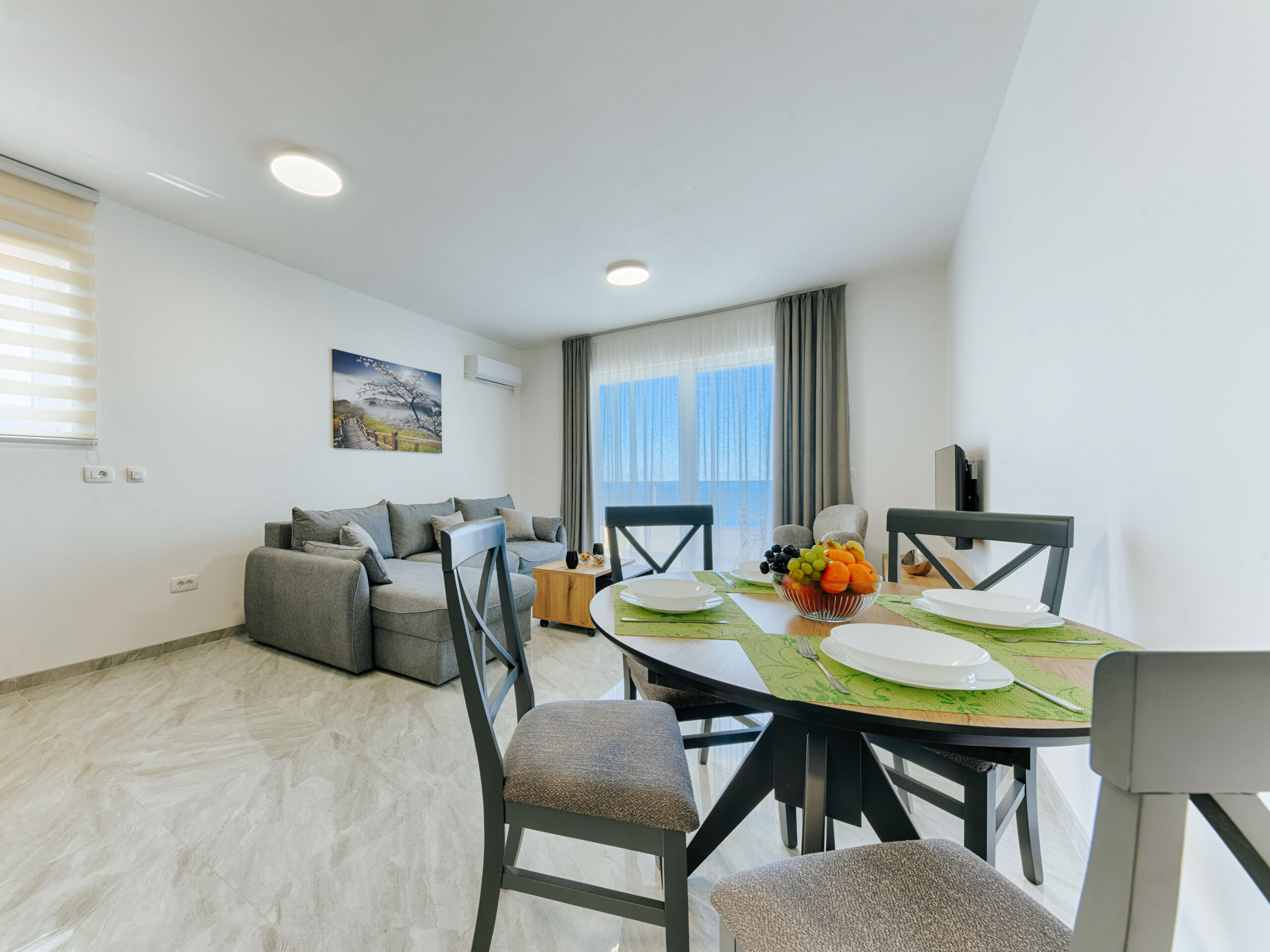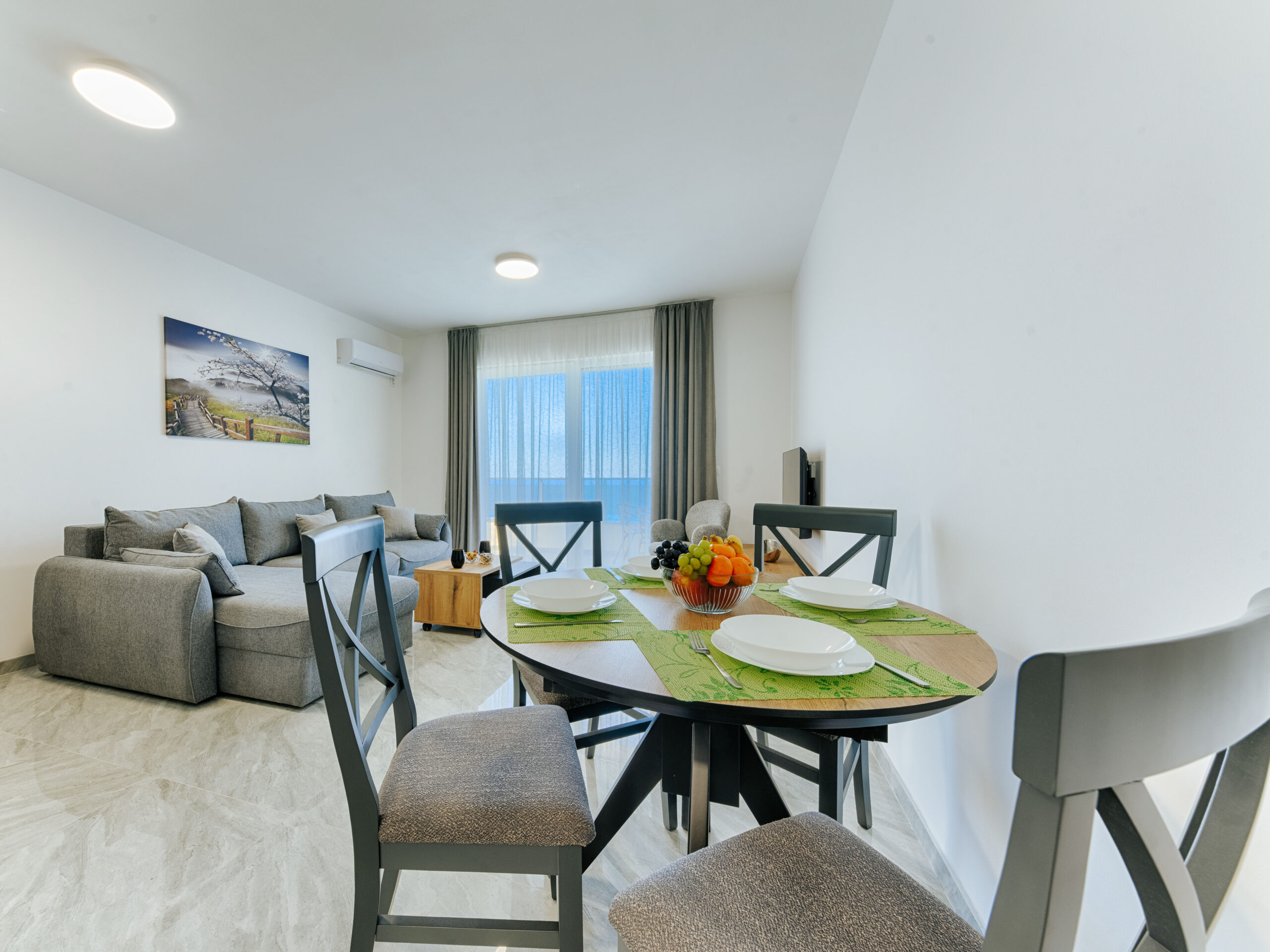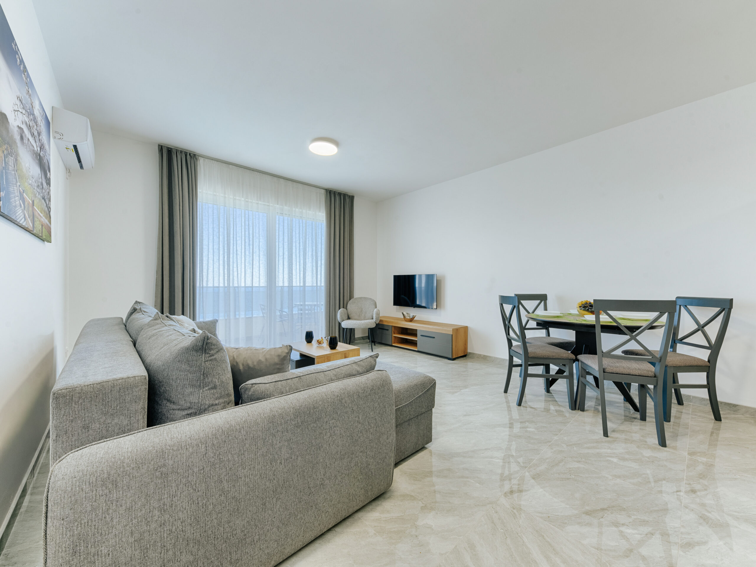 AP18 – Apartament z jedną sypialnią i salonem – max 5 osób zlokalizowany na piętrze czwartym. Apartament posiada balkon z meblami i widokiem na morze.