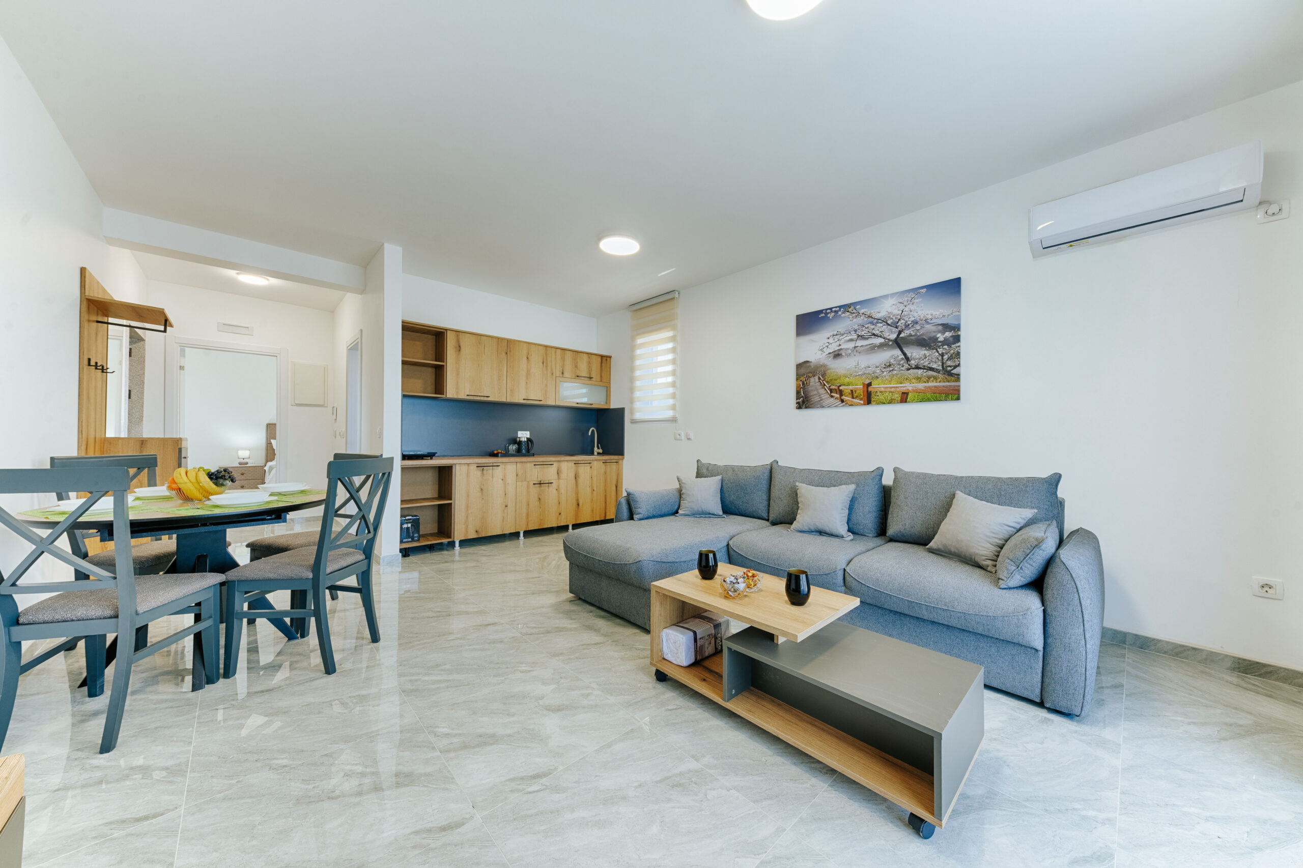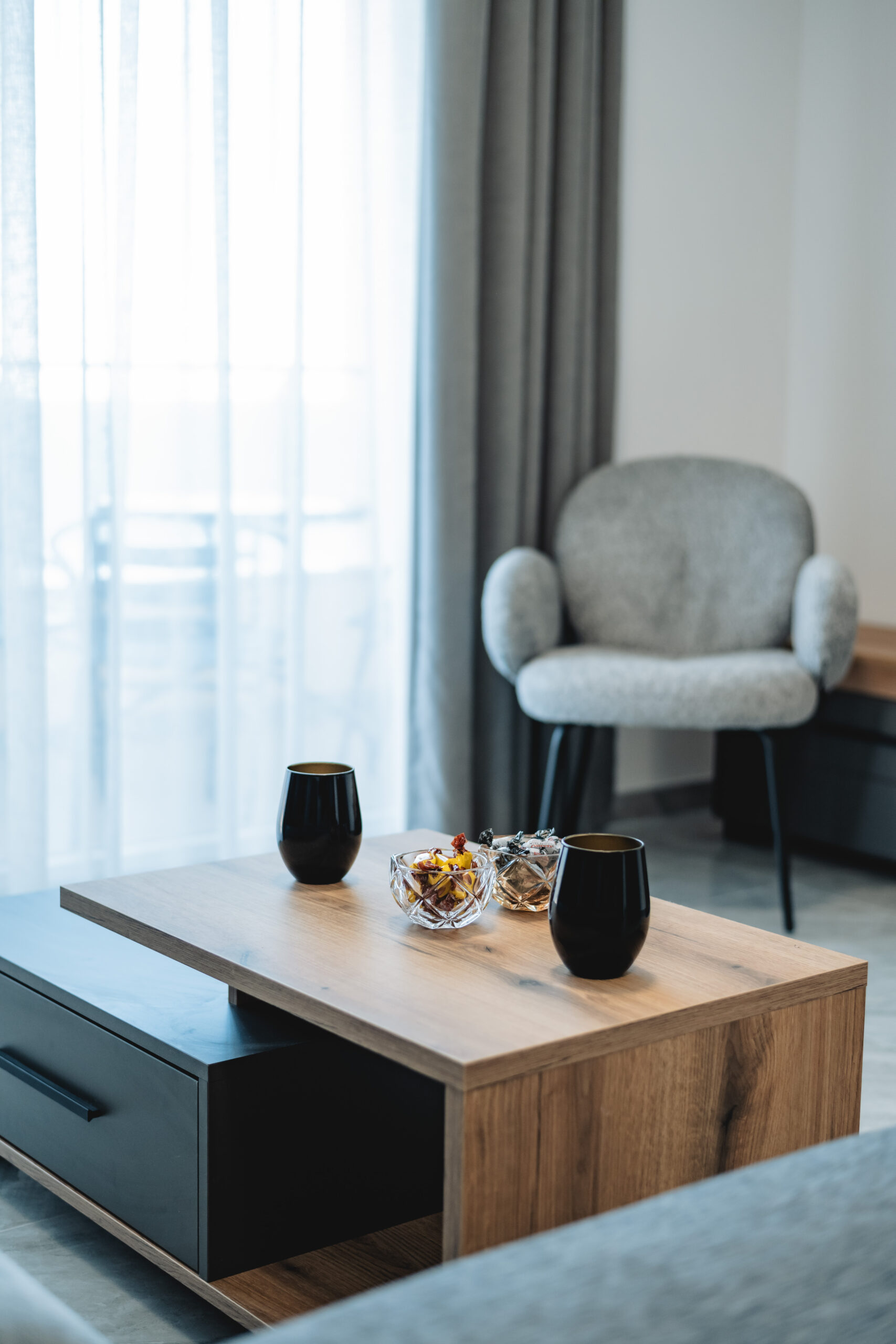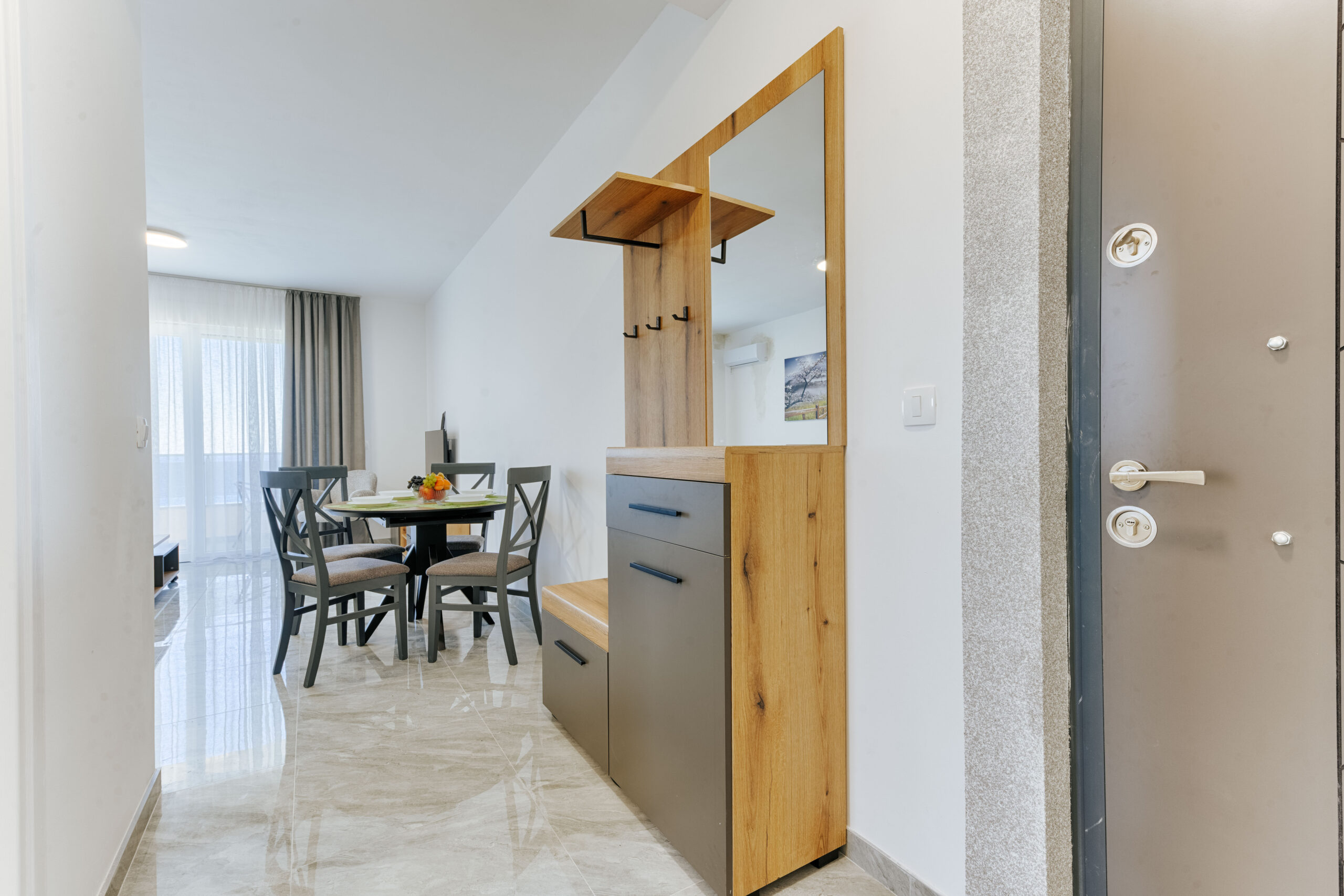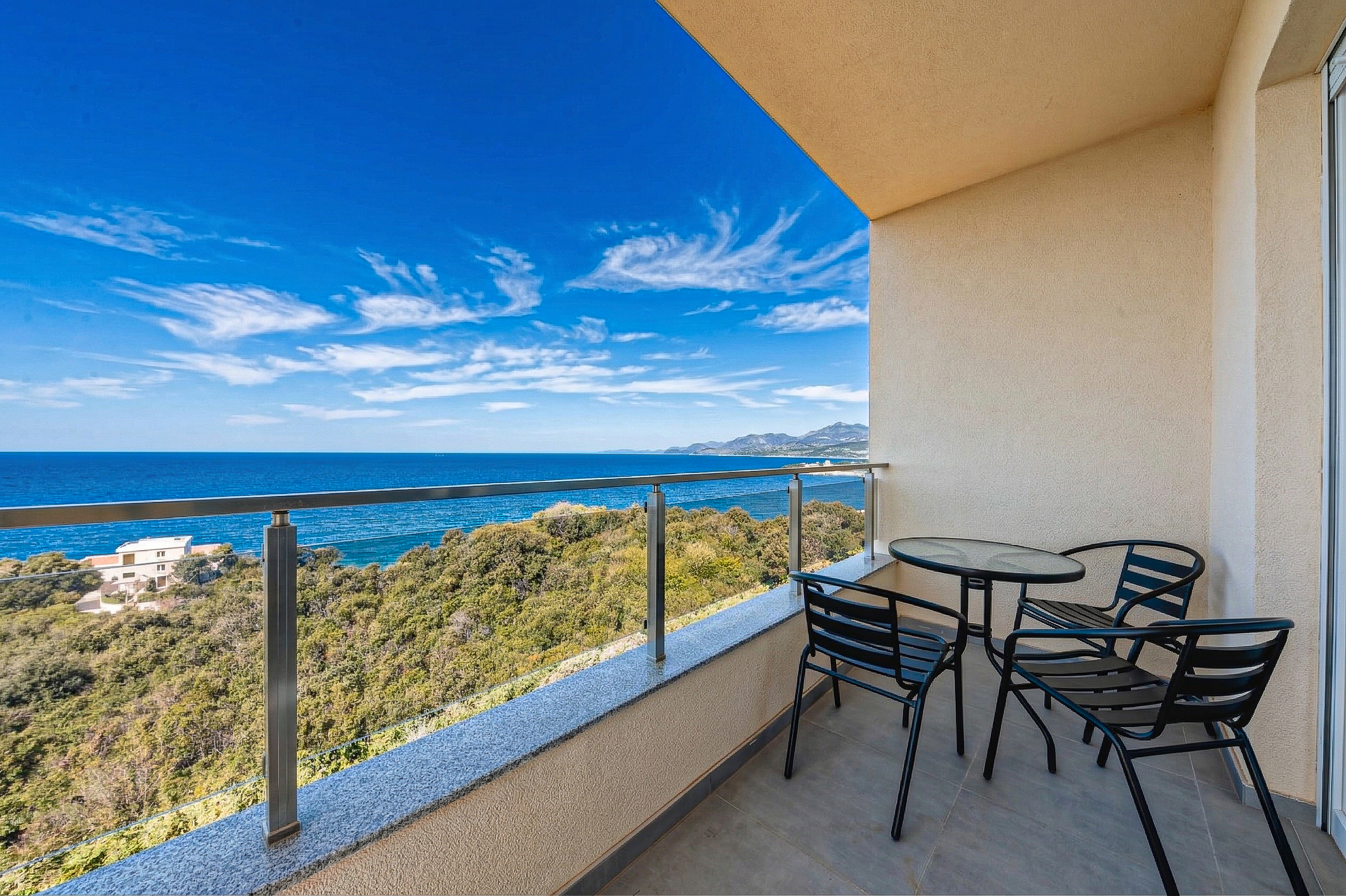 AP18 – Apartament z jedną sypialnią i salonem – max 5 osób zlokalizowany na piętrze czwartym. Apartament posiada balkon z meblami i widokiem na morze.