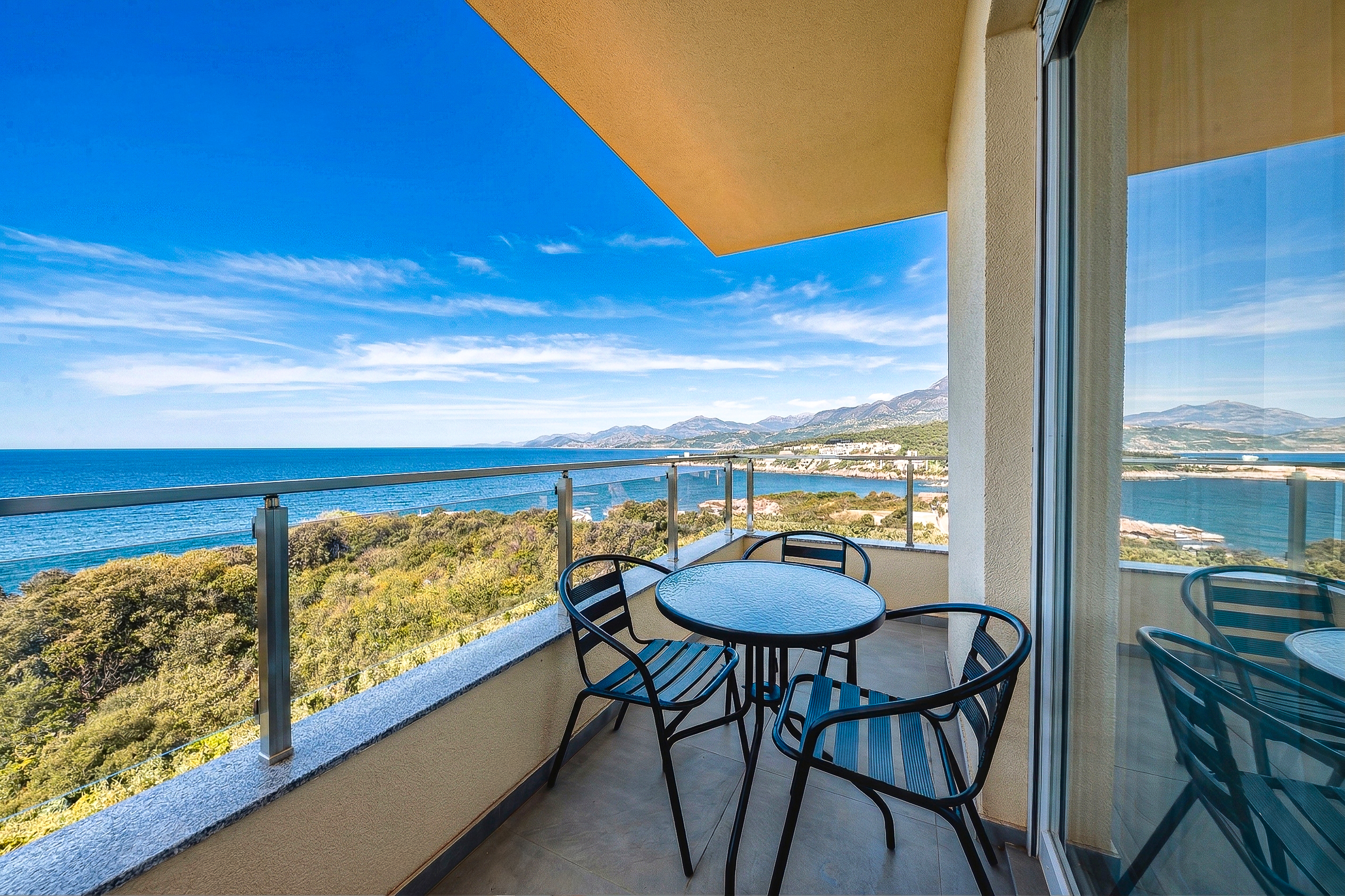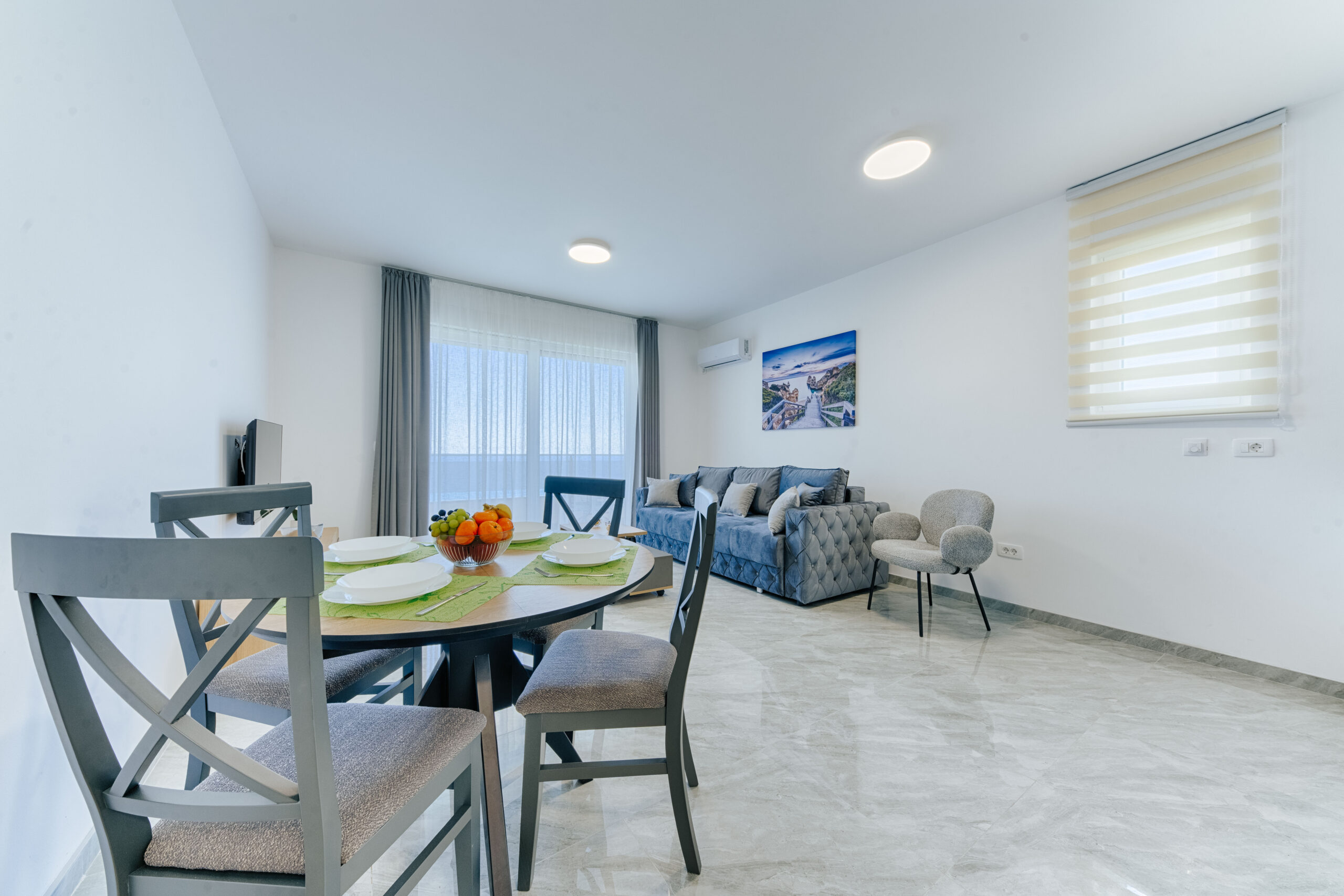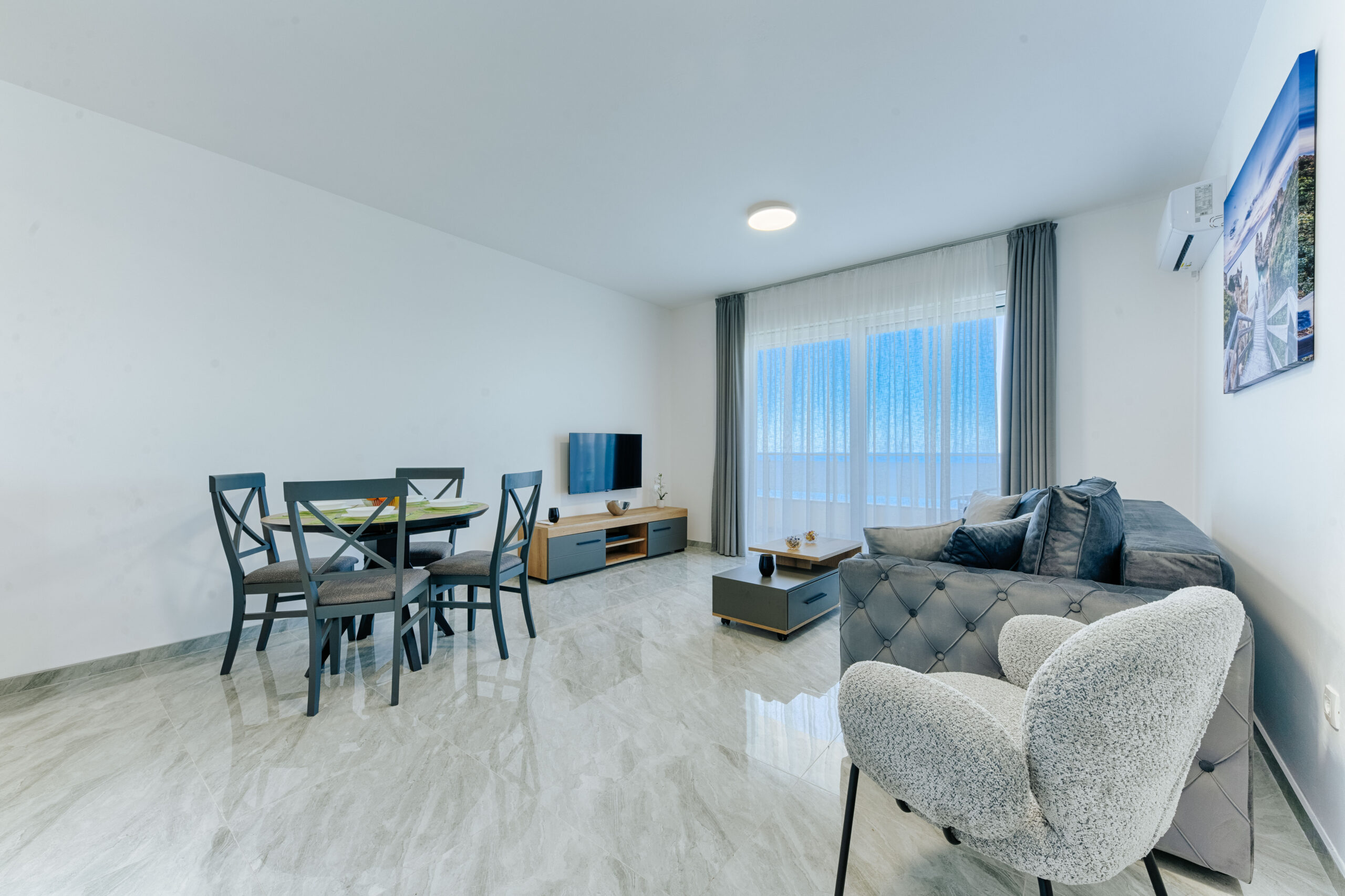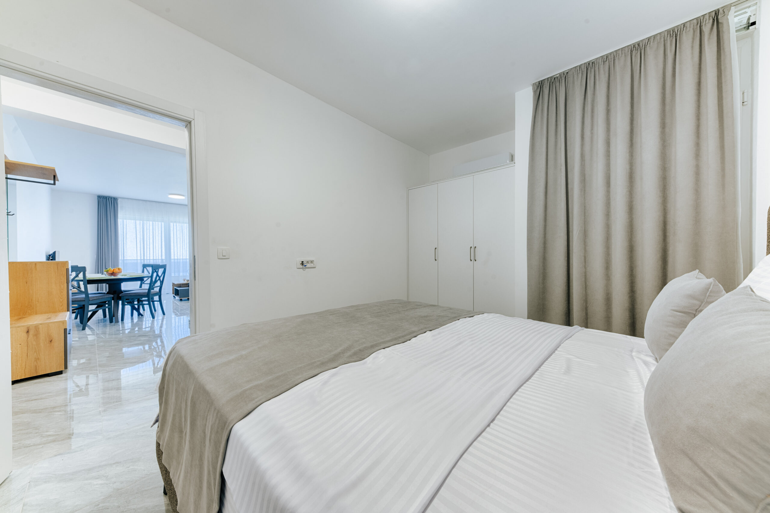 AP19 – Apartament z jedną sypialnią i salonem – max 5 osób zlokalizowany na piętrze czwartym. Apartament posiada balkon z meblami i widokiem na morze.