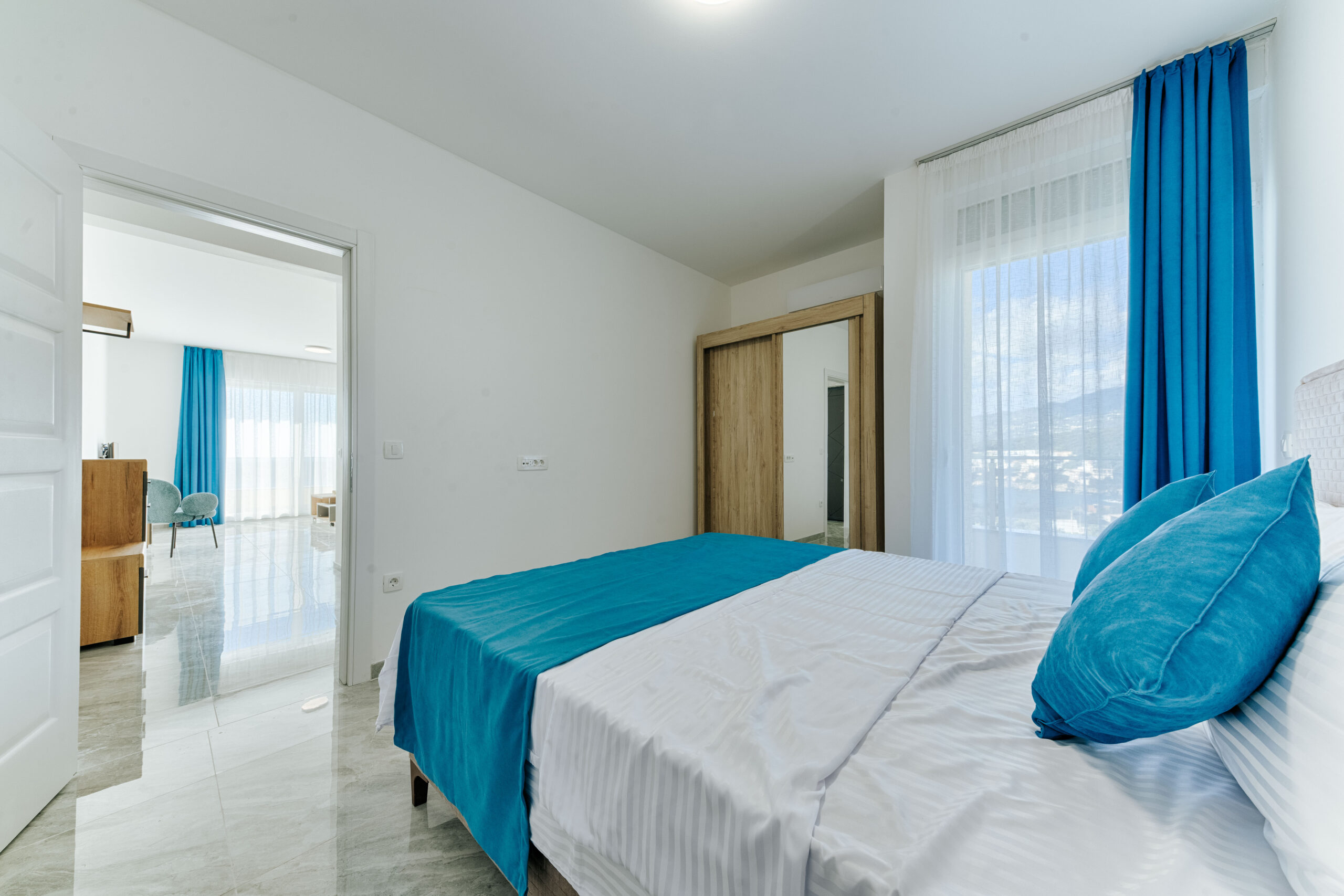 AP15 – Apartament z jedną sypialnią i salonem – max 5 osób zlokalizowany na piętrze trzecim. Apartament posiada balkon z meblami i widokiem na morze.
