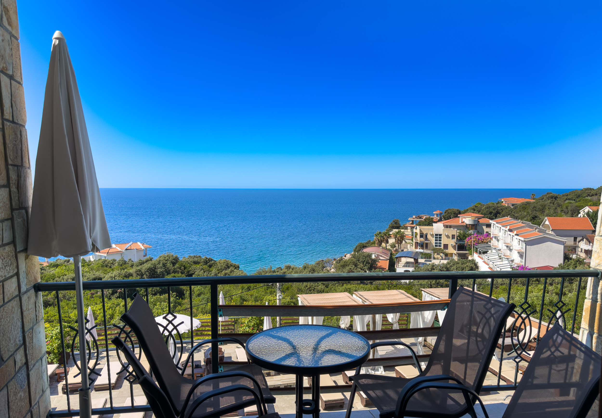 ✅ Balkon z widokiem na morze, meblami i parasolem
