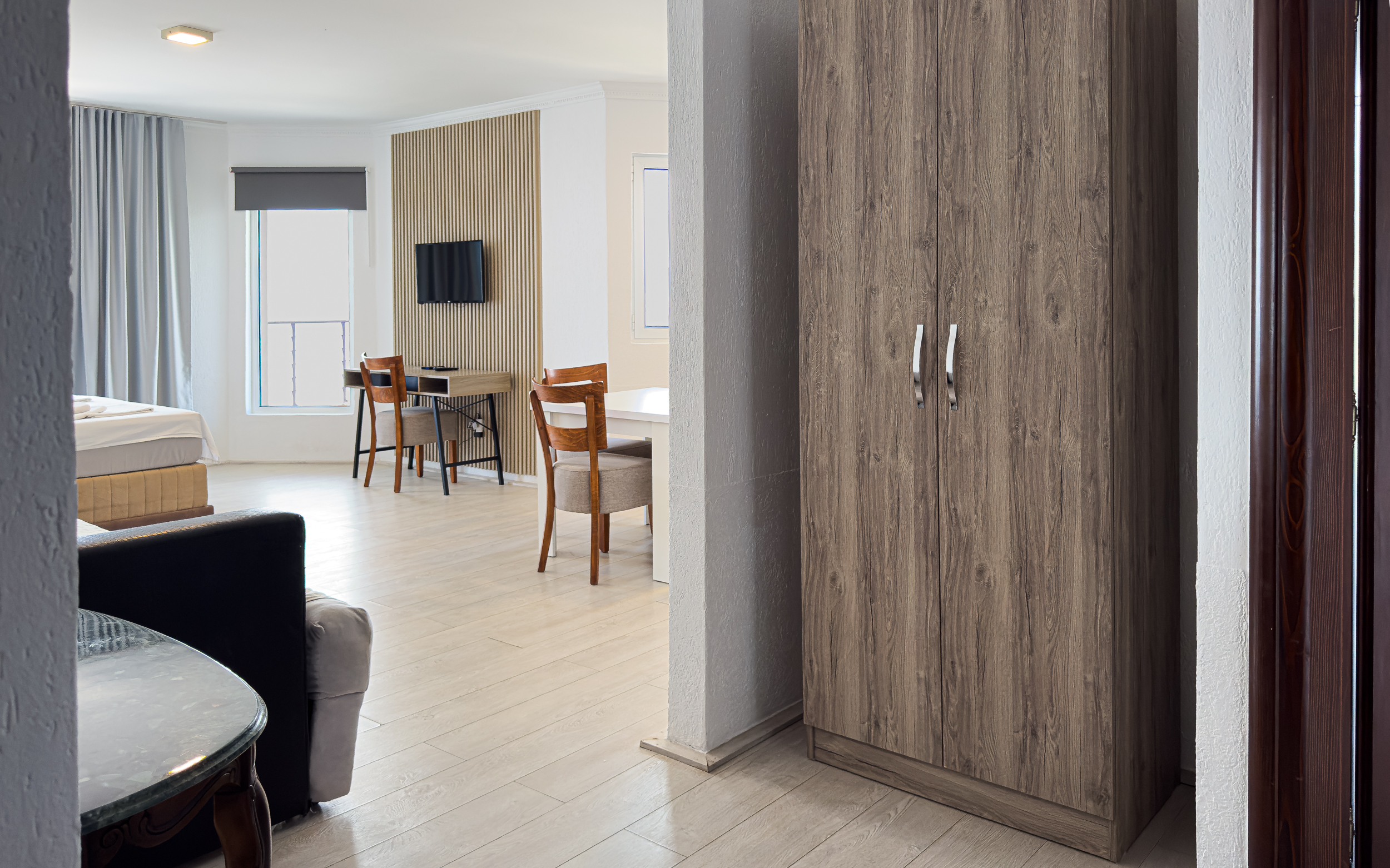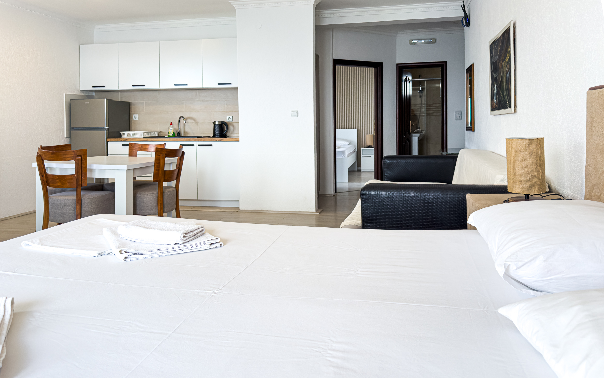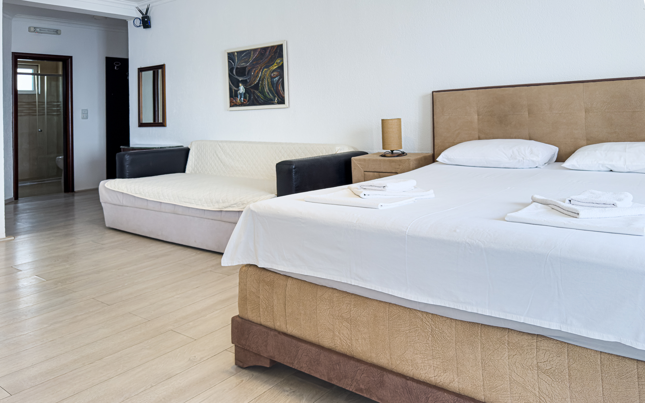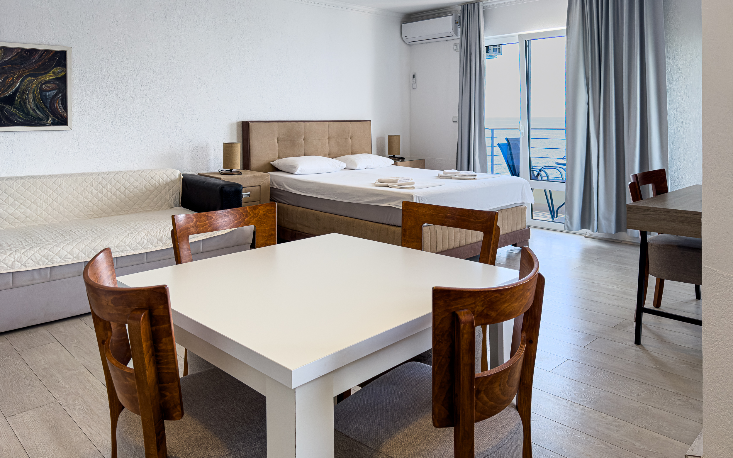 AP10 – Apartament z sypialnią i salonem z dużym łóżkiem małżeńskim w sypialni i salonie. Salon, pokój dzienny połączony jest z aneksem kuchennym i jadalnią. Apartament posiada dwa balkony na które jest wyjście z salonu i sypialni. Lokalizacja na czwartym piętrze po prawej stronie budynku patrząc w kierunku morza.