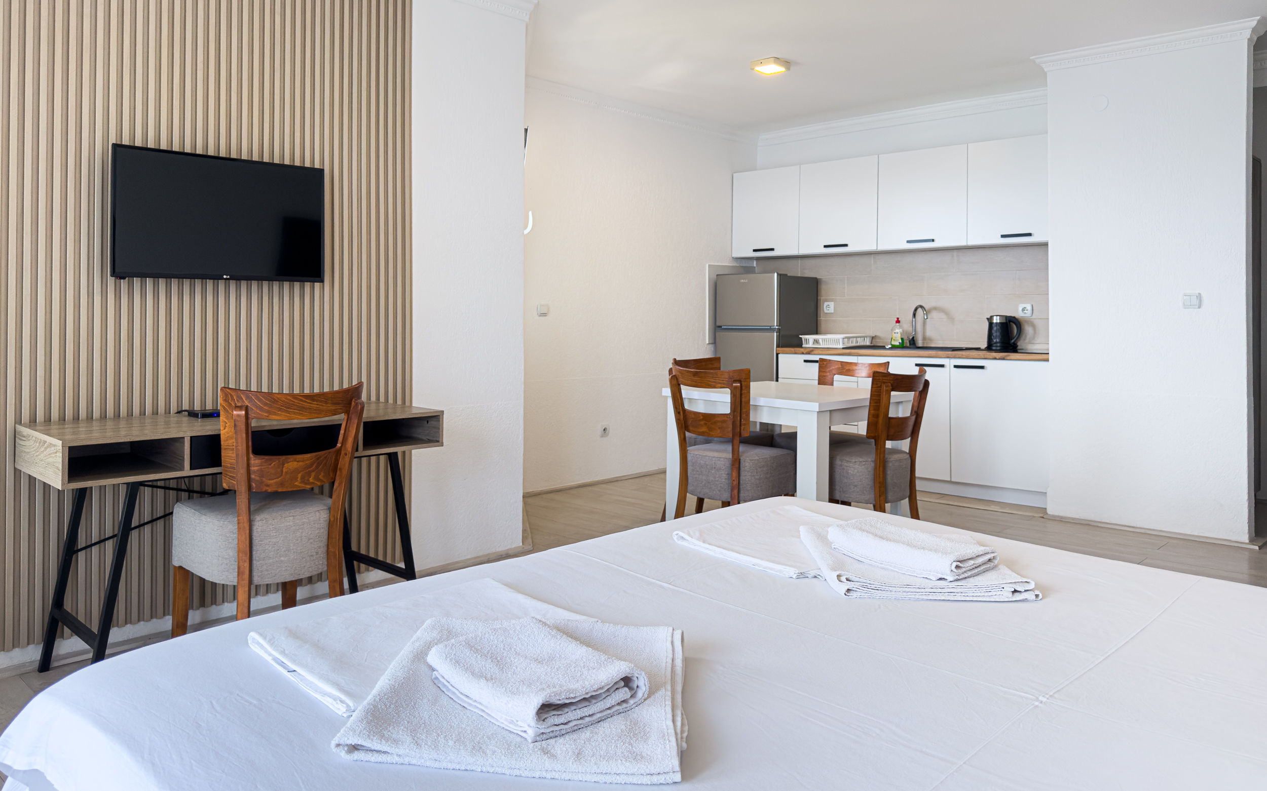 ✅ Salon, otwarta przestrzeń – łóżko małżeńskie z wygodnym materacem (możliwość rozsunięcia na dwa pojedyncze łóżka) i wygodna rozkładana sofa
