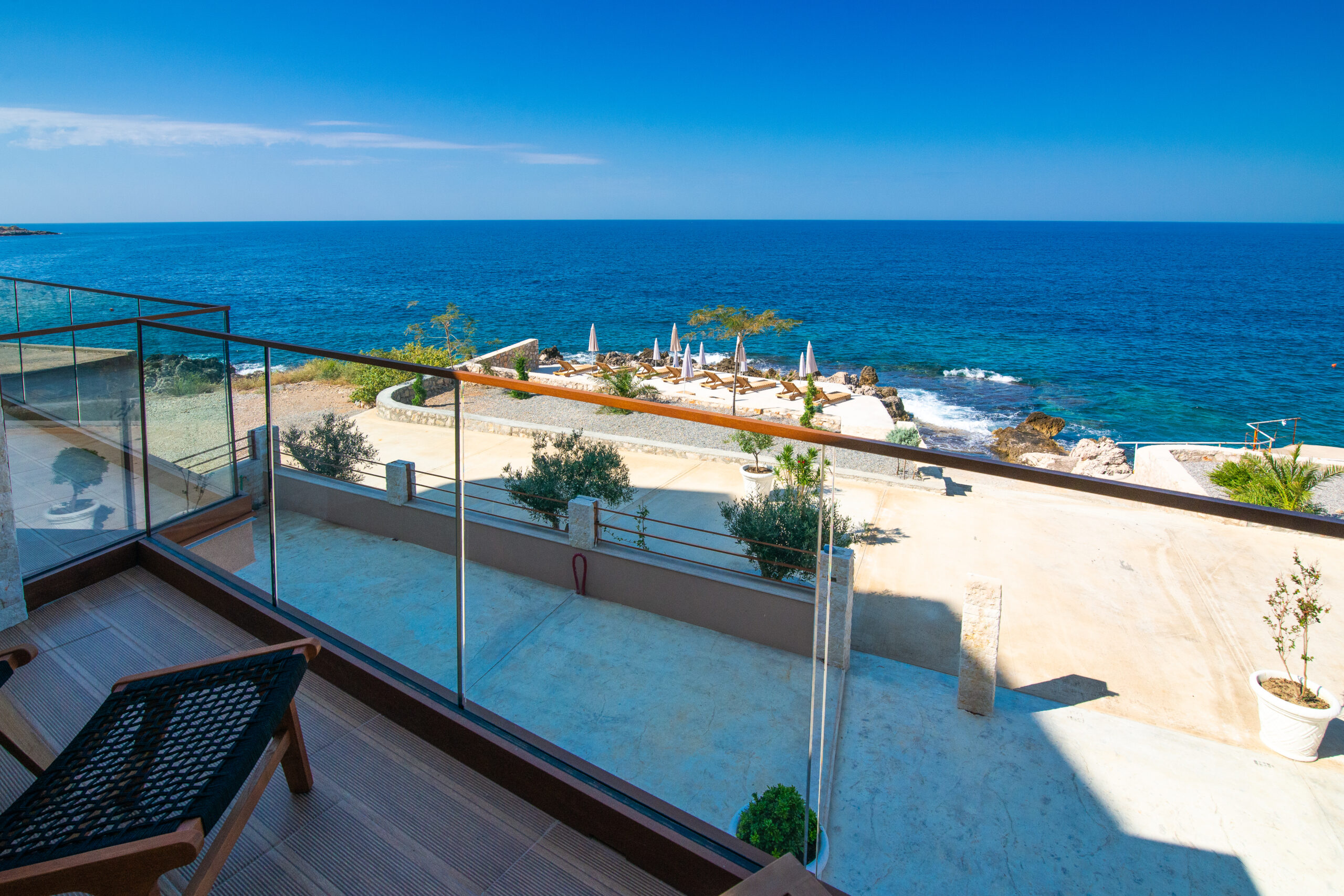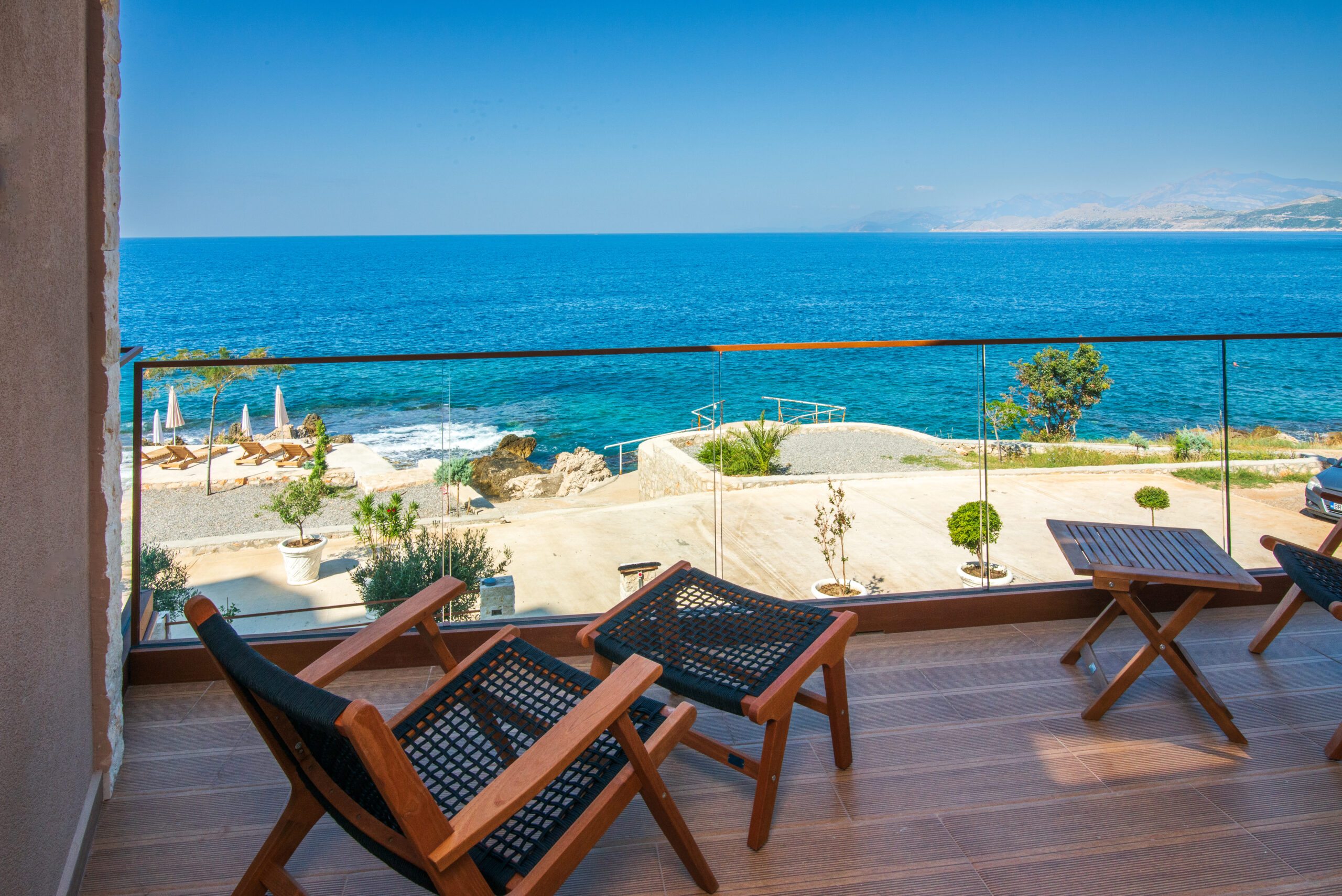 Balkon z widokiem na morze i meblami